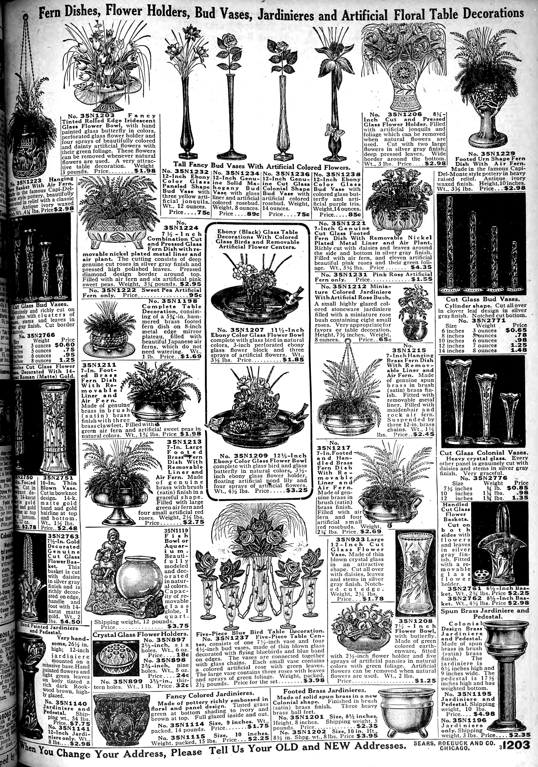 | 1918 | Fall | 1203 | Tall Fancy Bud Vases with Artificial Colored Flowers 12" Ebony Colored Glass Panel Shaped Bud Vase 12" Genuine Cut Glass Colonial Shape Bud Vase 12" Ebony Colored Glass Bud Vase with Colored Glass Butterfly |