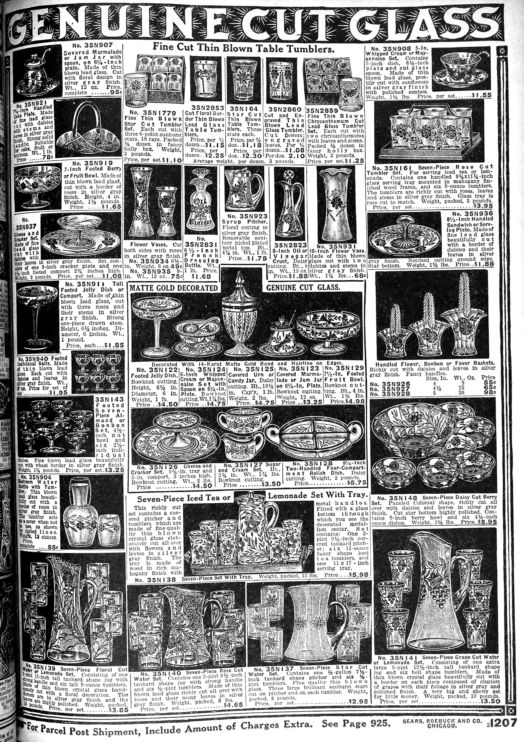 | 1918 | Fall | 1207 | Matte Gold Decorated Genuine Cut Glass Footed Jelly Dish 5" Whipped Cream or Mayonnaise Set Covered Urn or Candy Jar Covered Marmalade or Jam Jar on 6¼" Plate 7½" Footed Fruit Bowl Cheese and Cracker Set Sugar and Cream Set |