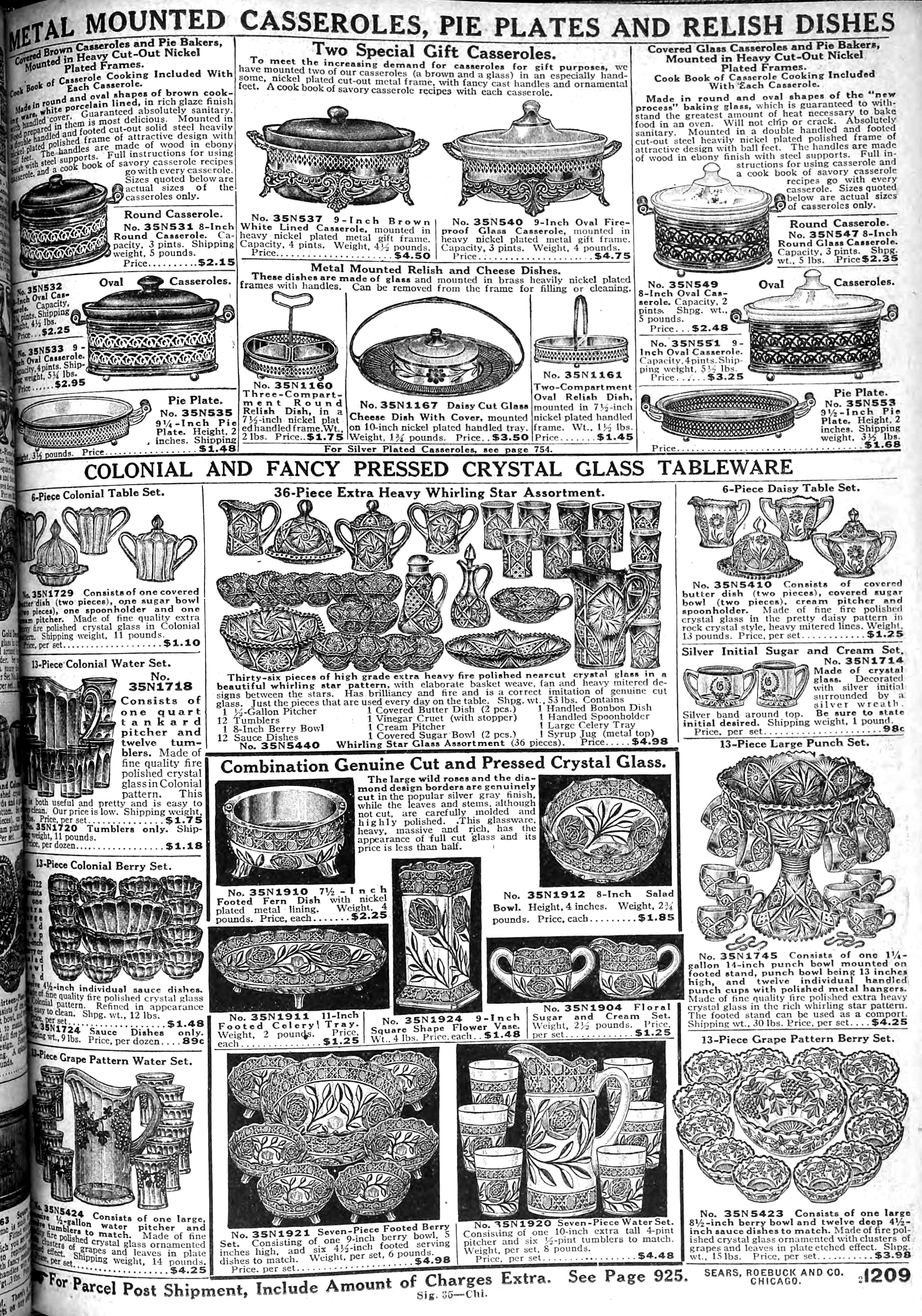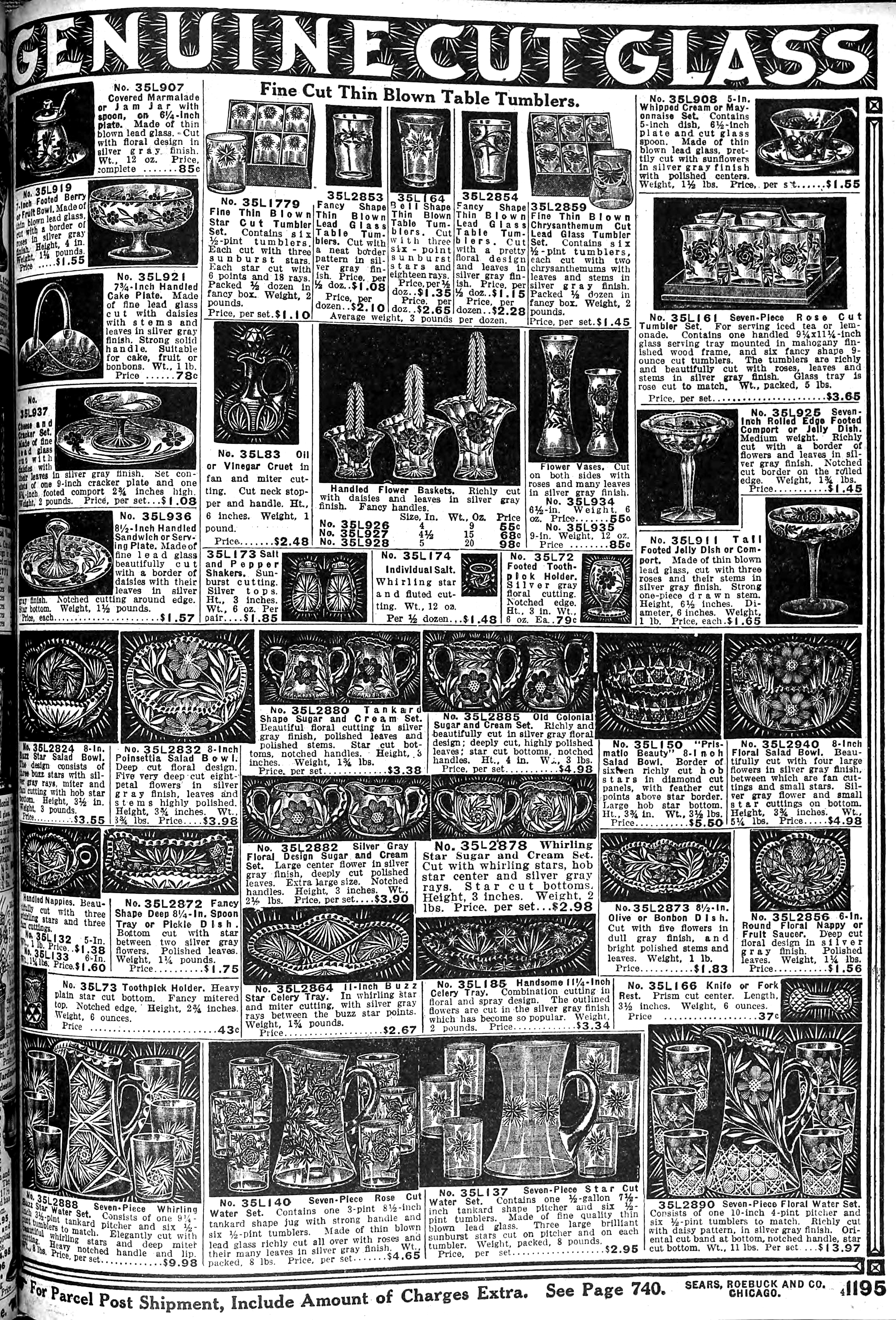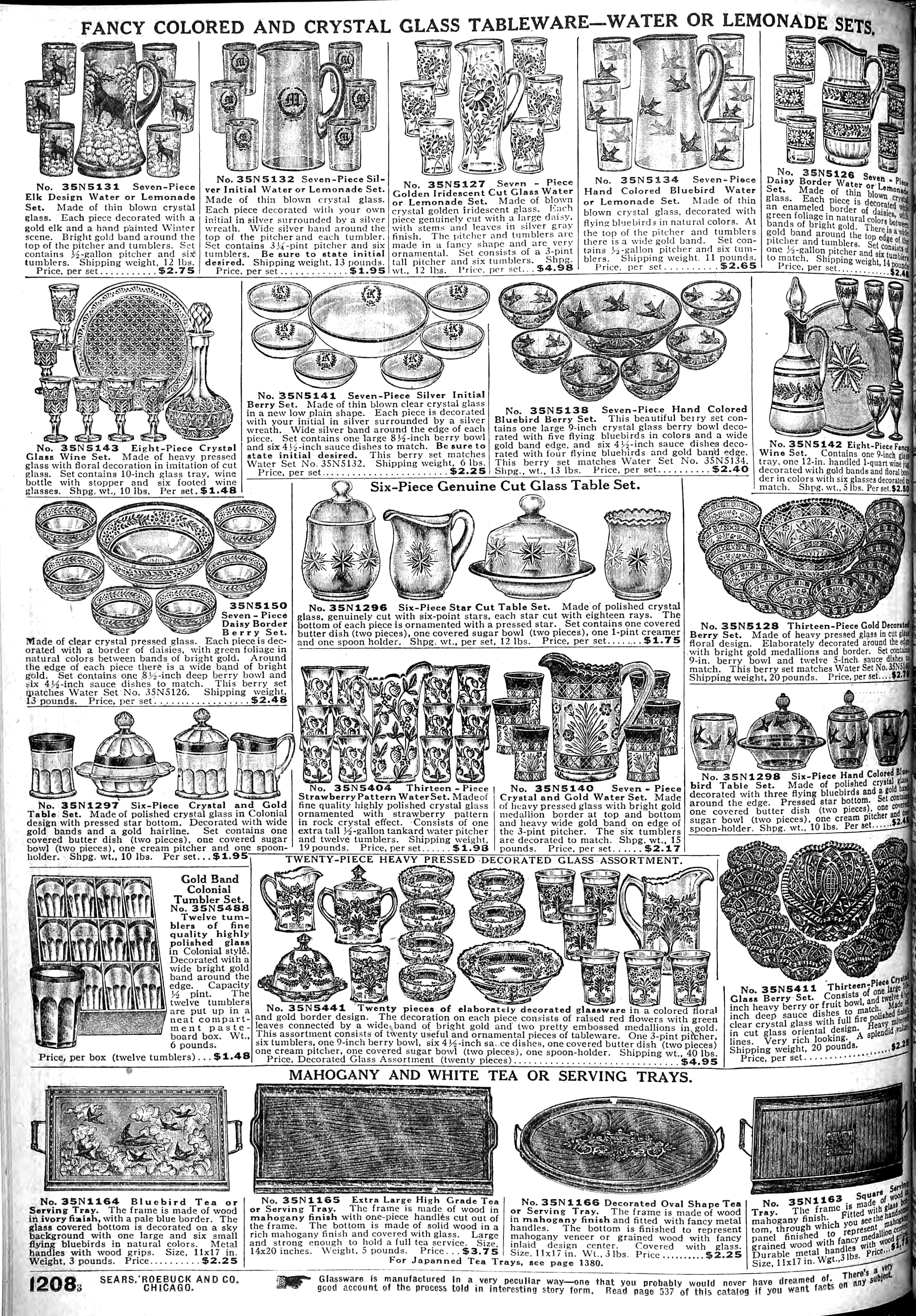 | 1918 | Fall | 1208 | 6-Piece Genuine Cut Glass Table Set Covered Butter Dish (2 pieces) Covered Sugar Bowl (2 pieces) 1-Pint Creamer Spoon Holder |