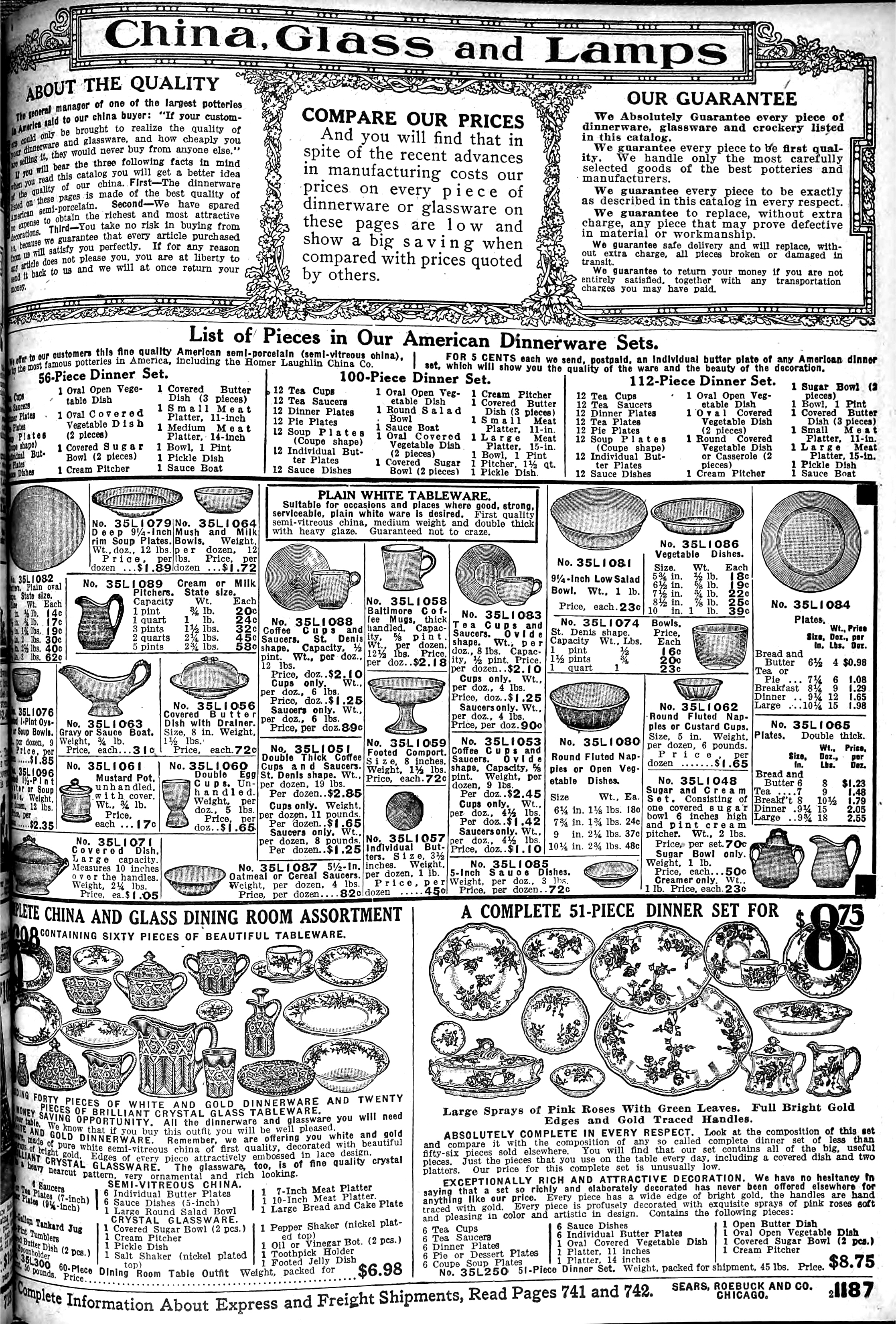 | 1918 | Spring | 1187 | Complete China and Glass Dining Room Assortment - 60 pieces Half-Gallon Tankard Jug Half-Pint Tumbler (6 pieces) Covered Butter Dish (2 pieces) Tall Spoonholder Covered Sugar Bowl (2 pieces) Cream Pitcher Pickle Dish Salt Shaker (nickeled top) Pepper Shaker (nickeled top) Oil or Vinegar Bottle (2 pieces) Toothpick Holder Footed Jelly Dish |