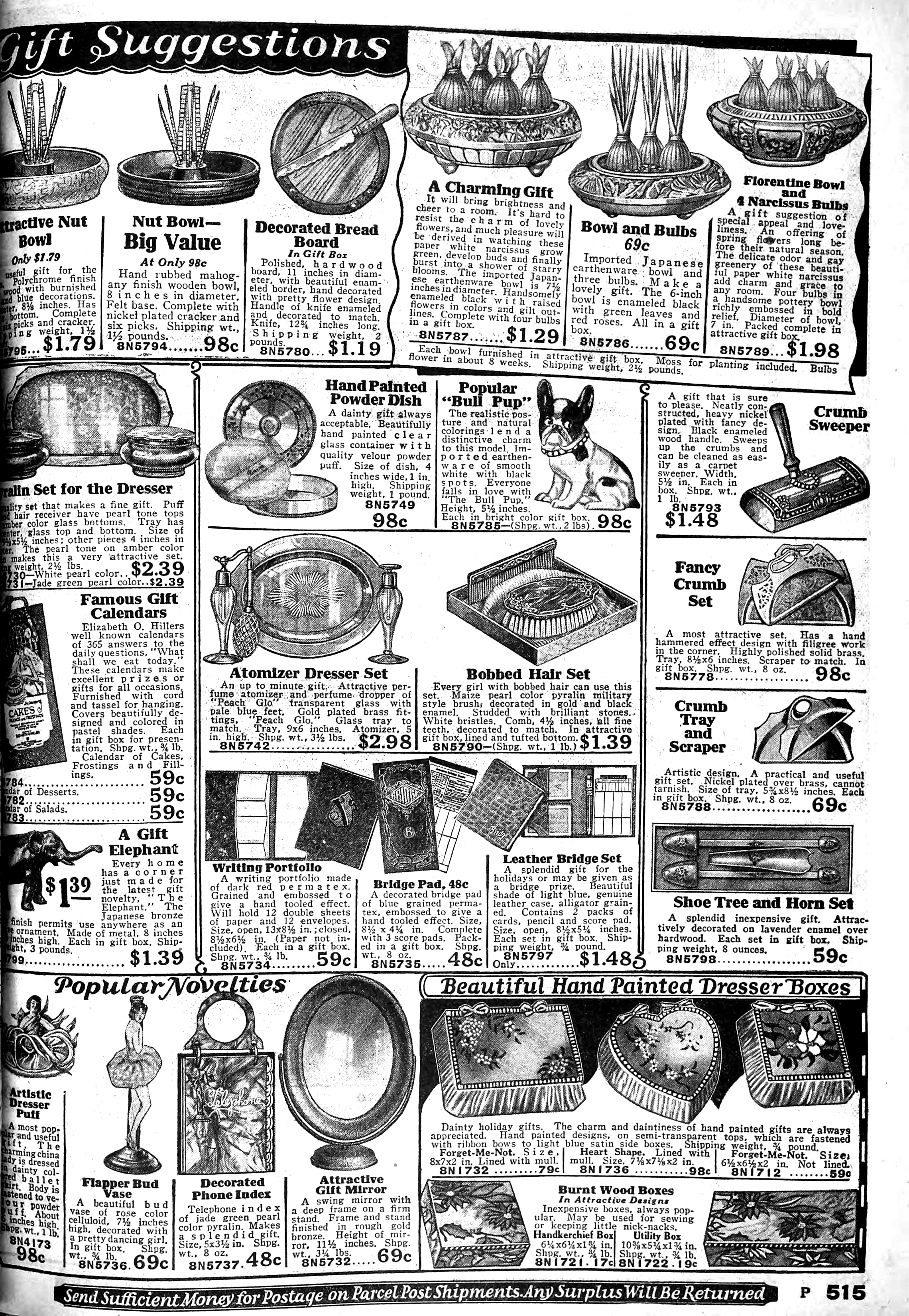 | 1928 | Spring | 749 | 4-piece Vanity Set, Satin Finish Rose Pink 11" Tray, Satin Finish Rose Pink 4" Powder Box, Satin Finish Rose Pink 5" Perfumes, pair, Satin Finish Rose Pink 4-piece Vanity Set, Satin Finish Green 11" Tray, Satin Finish Green 4" Powder Box, Satin Finish Green 5" Perfumes, pair, Satin Finish Green |