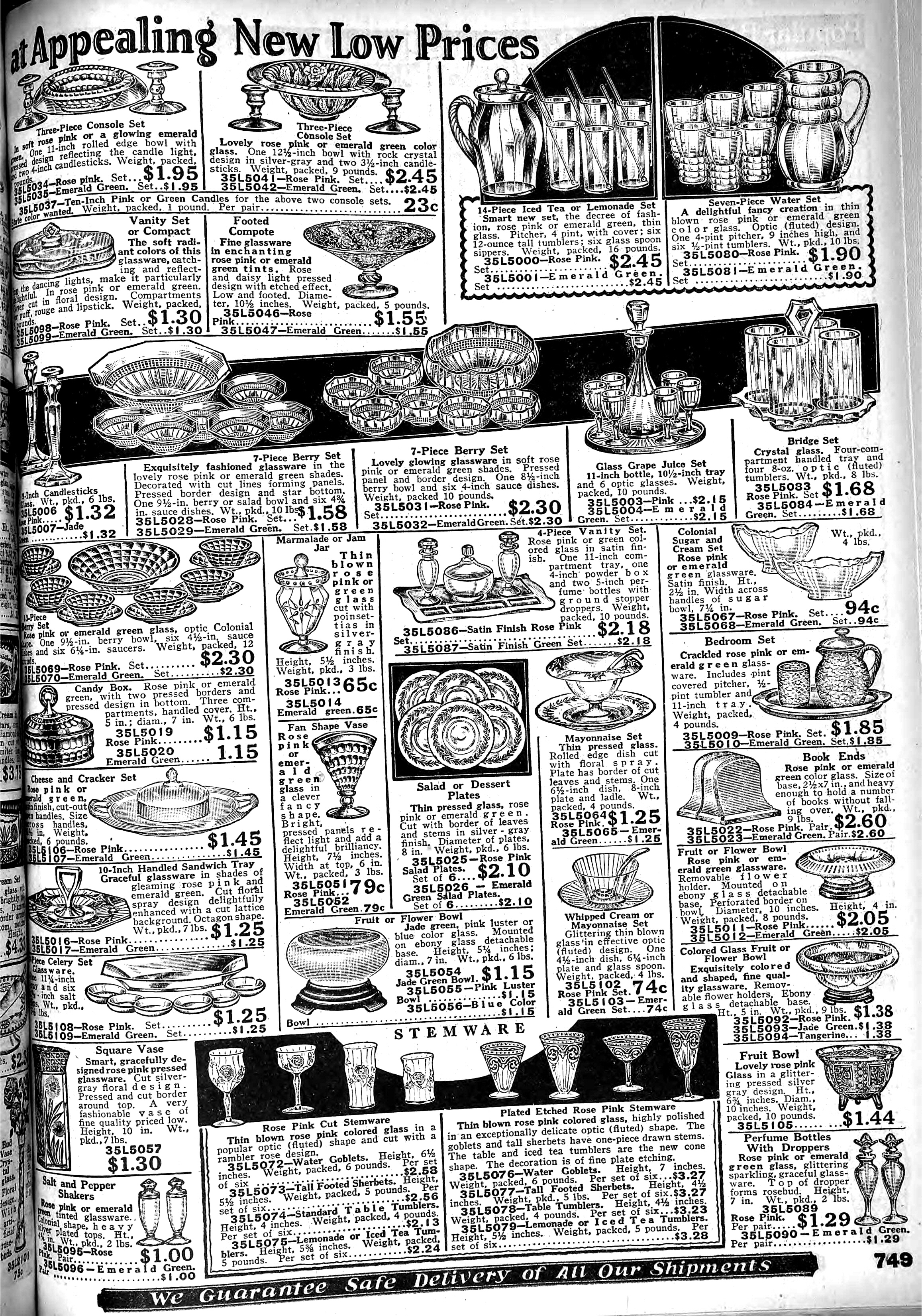 | 1928 | Spring | 749 | Three-piece Console Set, Rose Pink 11" Rolled Edge bowl, Rose Pink 4" Candlesticks, Pair, Pink Three-piece Console Set, Emerald Green 11" Rolled Edge bowl, Emerald Green 4" Candlesticks, Pair, Green |
