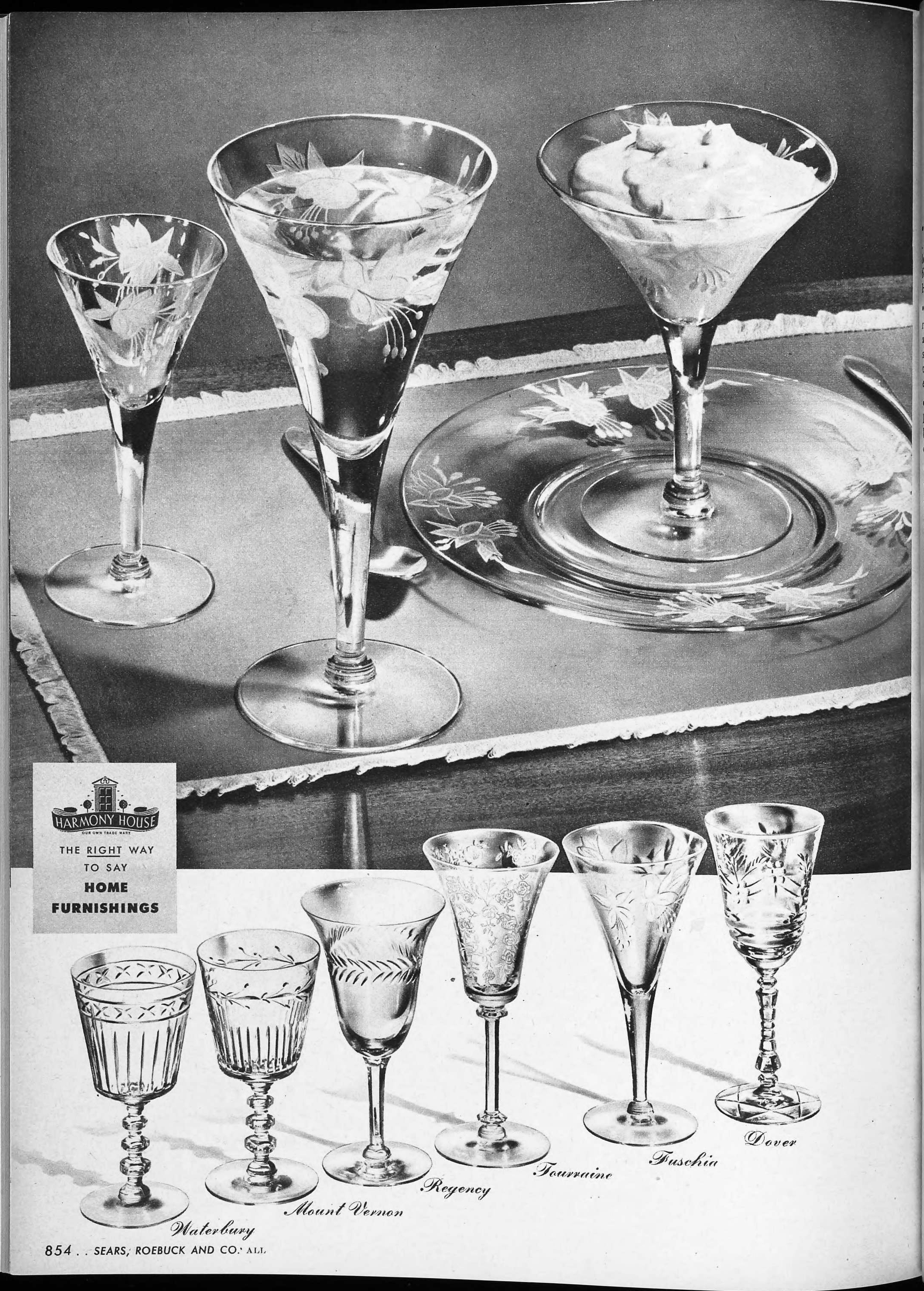| 1946 | Fall | 855 | “Mount Vernon” Engraving Individual Items: 8 oz. Goblet 8” Salad Plate 5 oz. High Sherbet 2½ oz. Cocktail 10 oz. Footed Ice Tea |