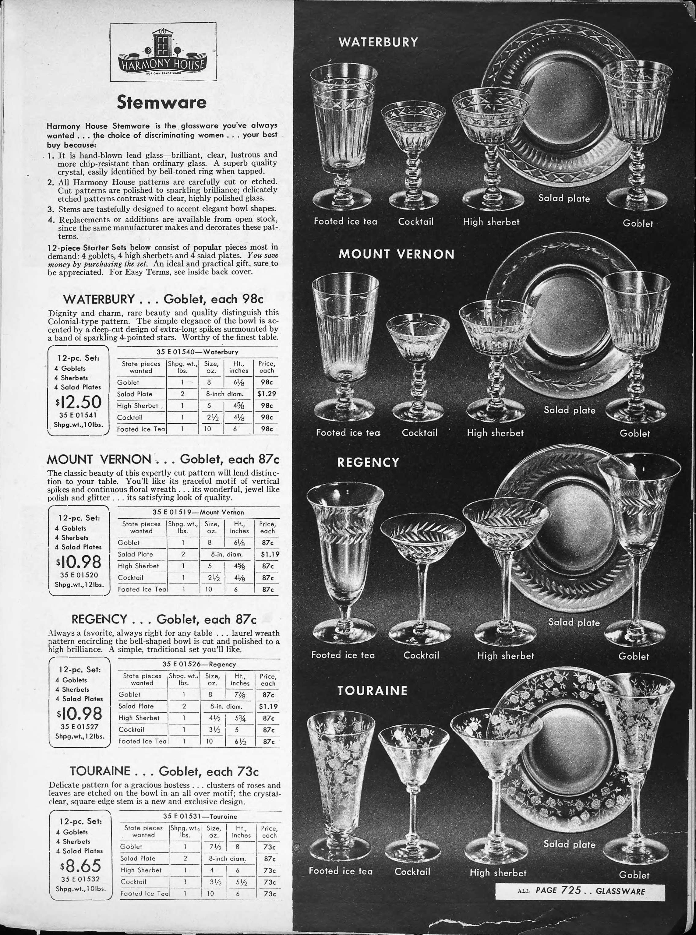| 1946 | Spring | 725 | “Mount Vernon” Engraving 12-piece Starter Set: 8 oz. Goblet (4-pieces) 5 oz. High Sherbet (4-pieces) 8” Salad Plate (4-pieces) |