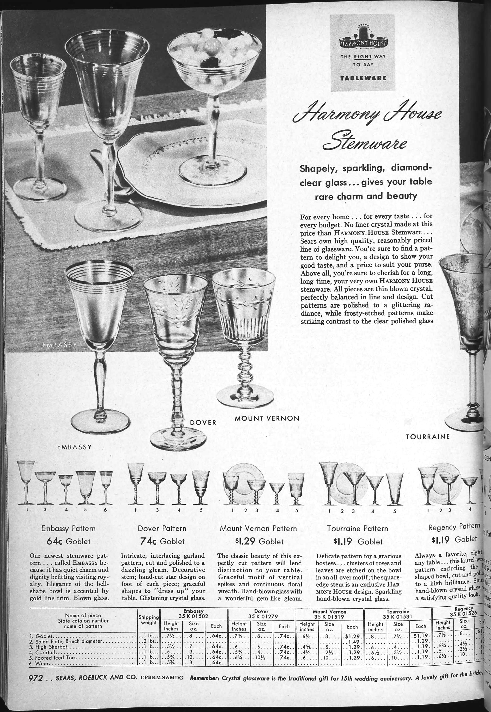 | 1947 | Fall | 972 | “Mount Vernon” Engraving Individual Items: 8 oz. Goblet 8” Salad Plate 5 oz. High Sherbet 2½ oz. Cocktail 10 oz. Footed Ice Tea |