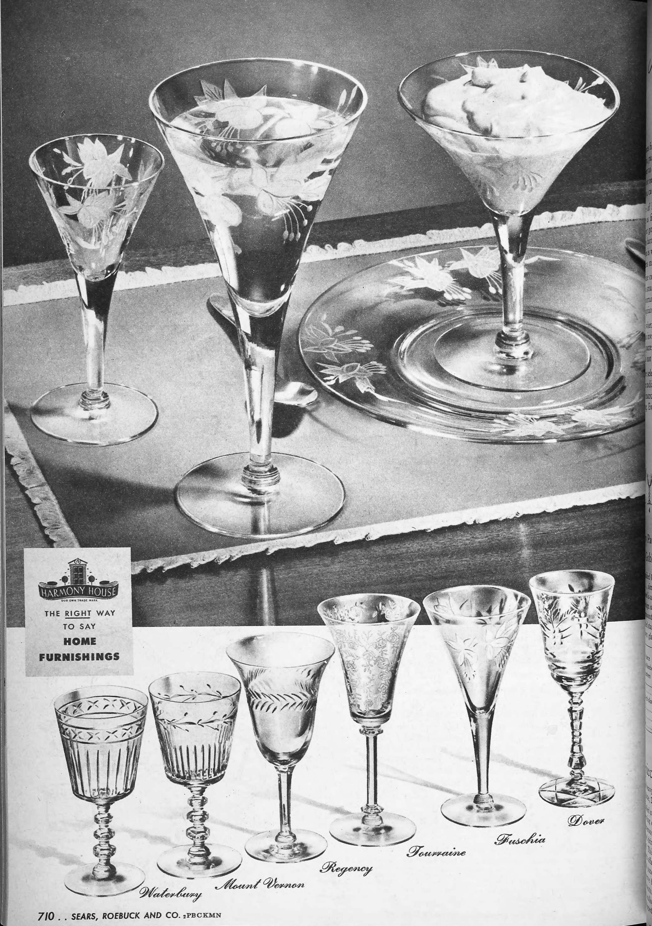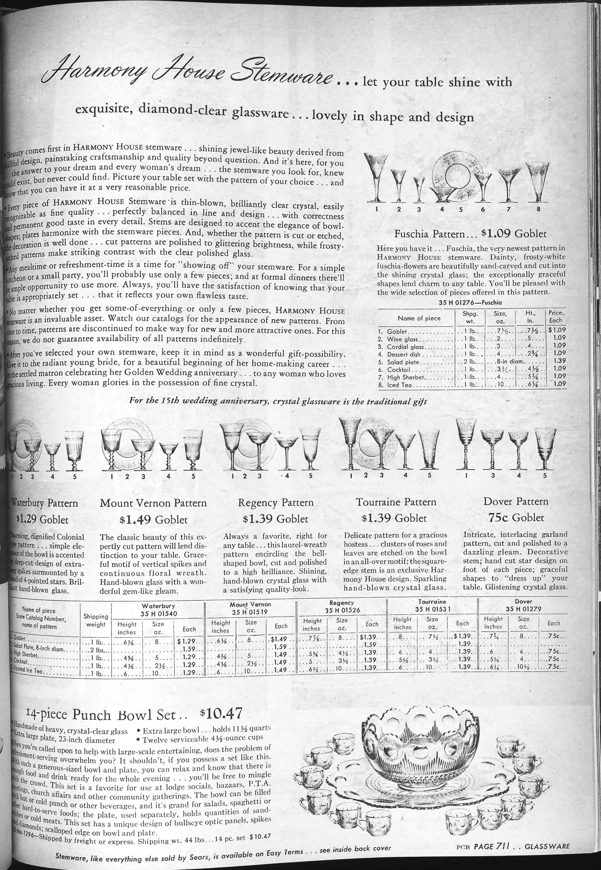 | 1947 | Spring | 711 | “Mount Vernon” Engraving Individual Items: 8 oz. Goblet 8” Salad Plate 5 oz. High Sherbet 2½ oz. Cocktail 10 oz. Footed Ice Tea |