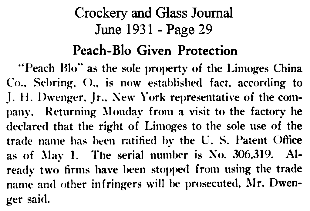 - "Peach-blo" recognized as property of Limoges Pottery, Sebring, OH