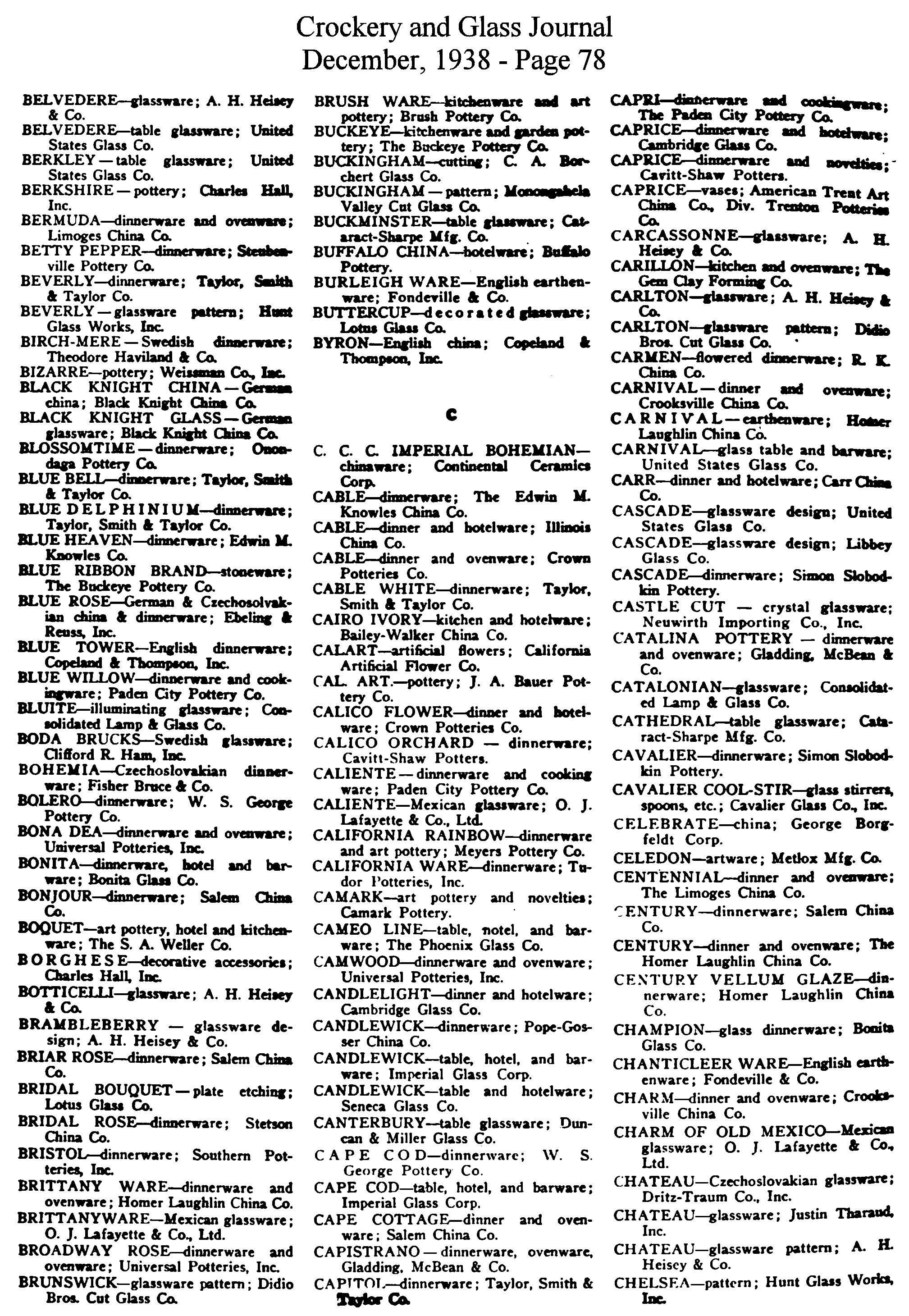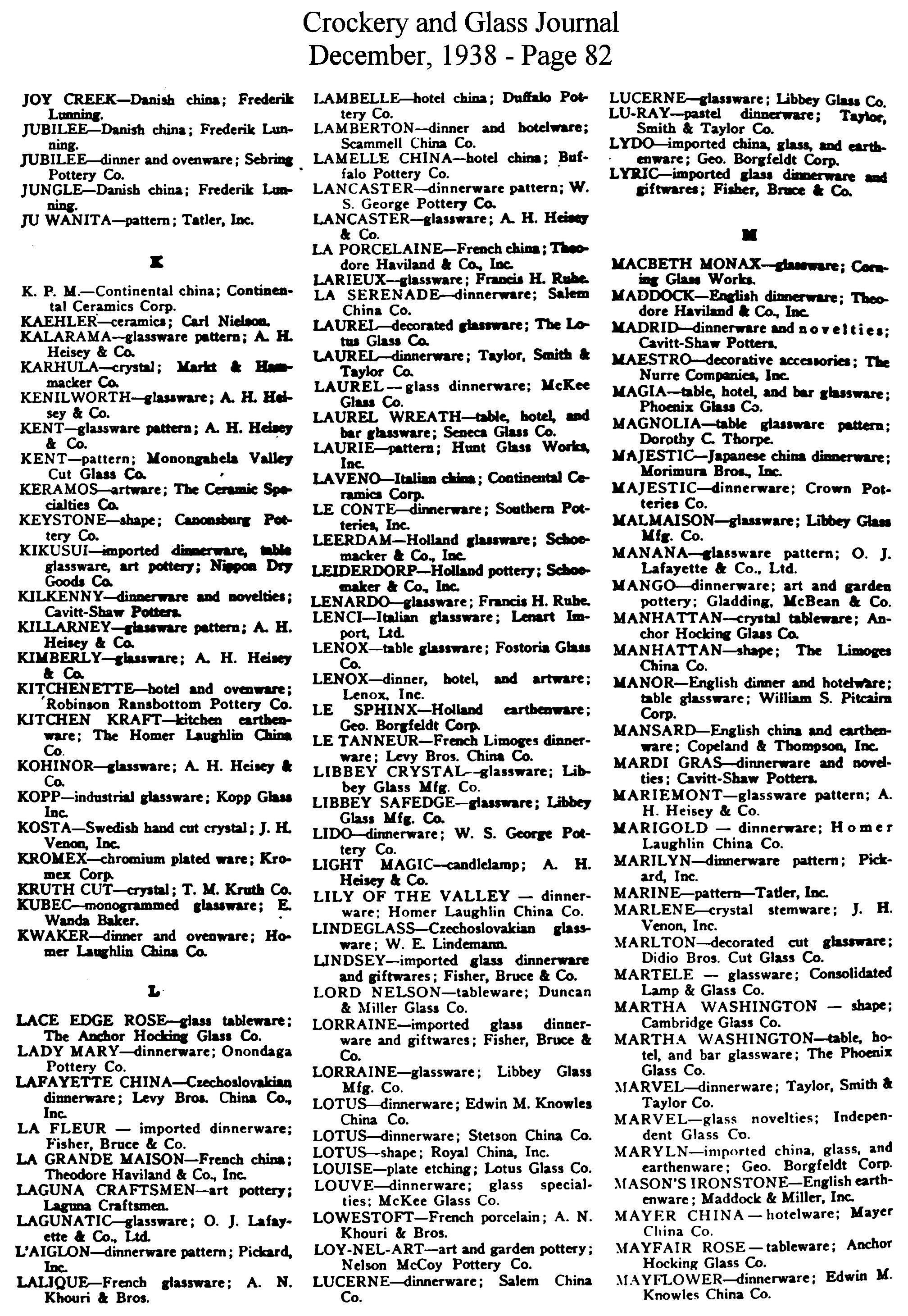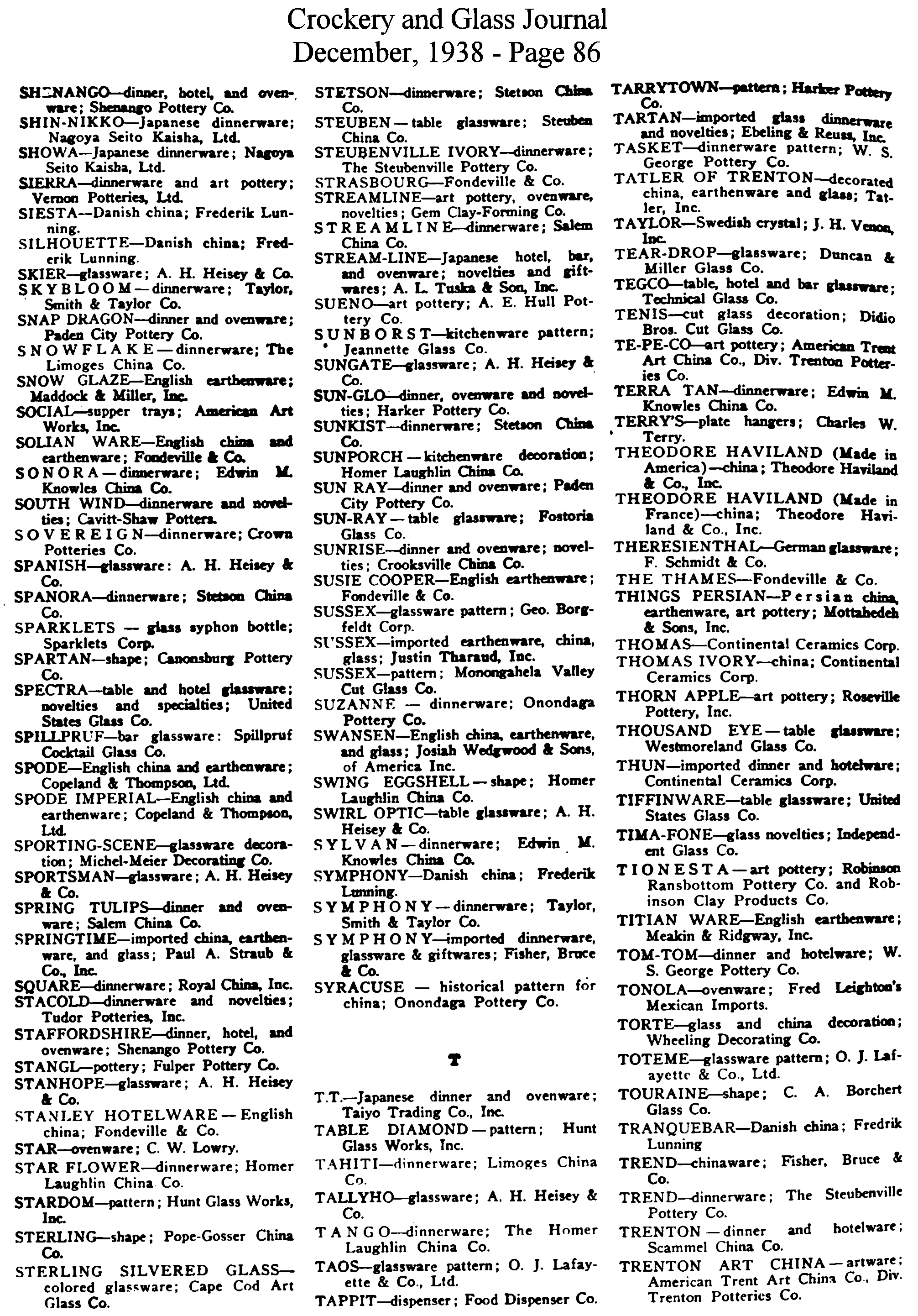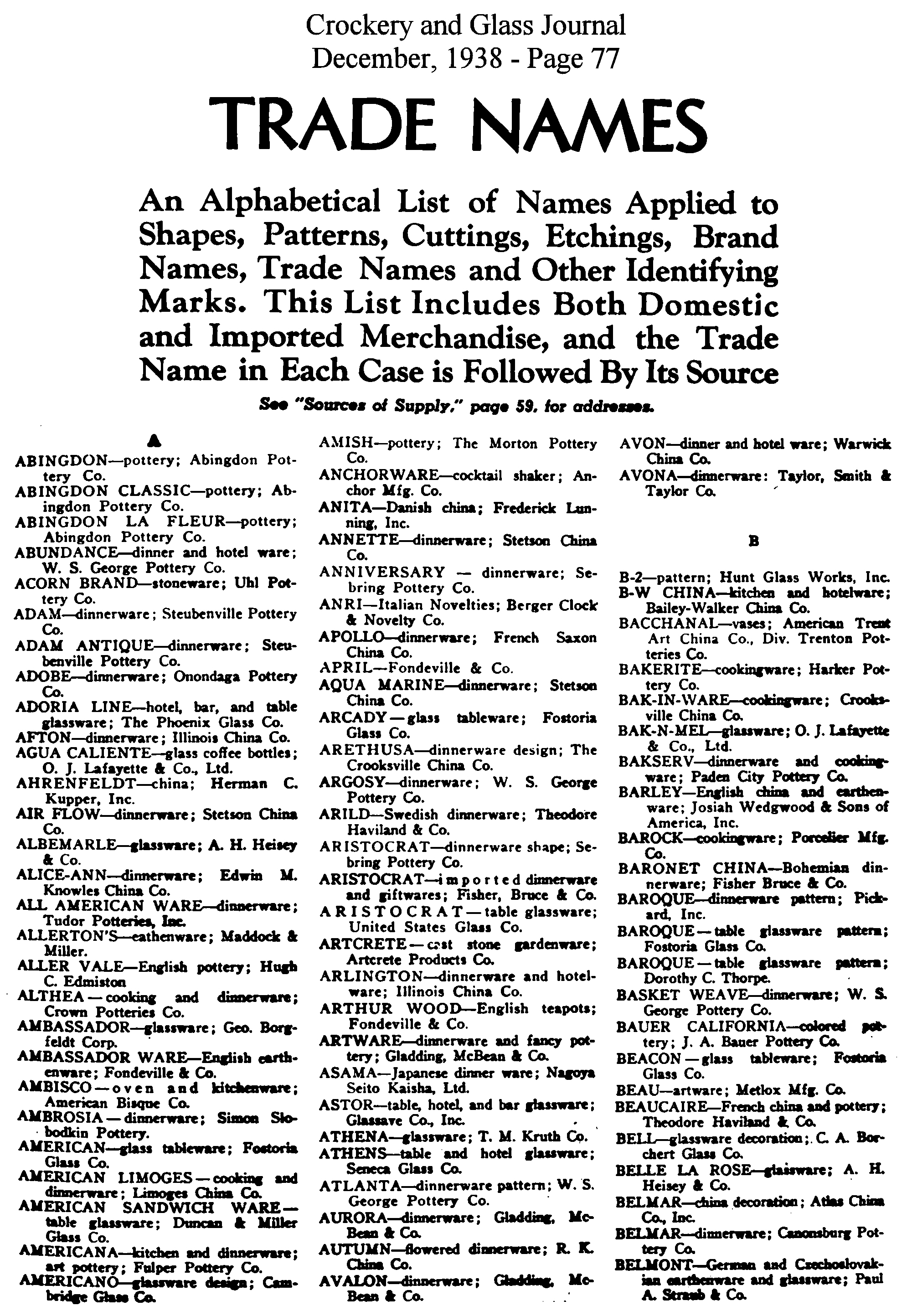 - List of Trade Names (December issue)